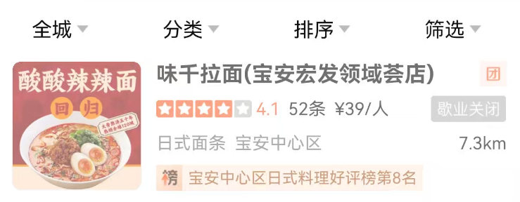 10月14日,南齐记者通过各人点评搜索“味千拉面宝安宏发规模荟店”泄漏,该店铺还是处于“停业关闭”现象。据“各人点评”APP泄漏,味千拉面在深圳有超25家门店。